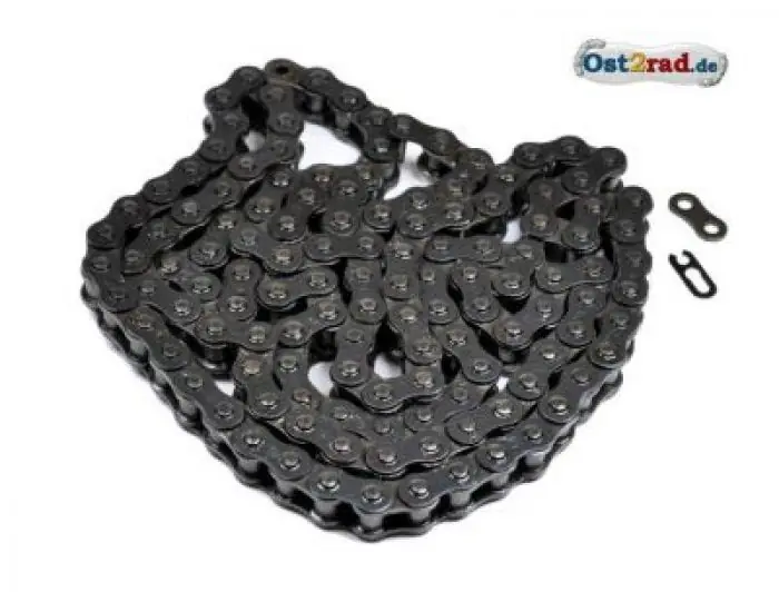 Antriebskette, 120 Glieder, die Kette muss je nach Radstand und Typ auf 85 – 99 Glieder gekürtzt werden, passend für alle IWL Typen wie Pitty, Wiesel, Troll und Berliner Roller. Es handelt sich um eine Rollenkette. Inkl. Kettenschloß. Schmale, alte Ausführung. Die genaue Bezeichnung lautet: 1×12,7×6,4×120.