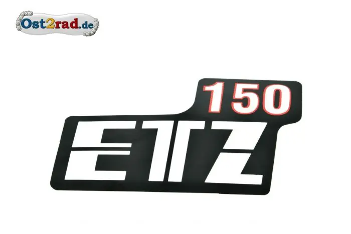 Neuer Aufkleber für den Seitendeckel MZ mit der Aufschrift ETZ 150 in der Farbe weiss mit einer roten Umrandung.