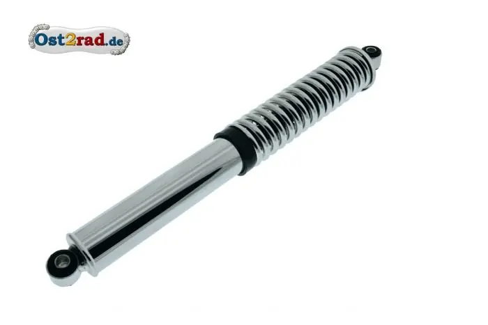 Hinteres Federbein, speziell für den Typ S 50. Es handelt sich um deutsche Produktion. Dieser Stößdämpfer ist mit außenliegender, verchromter Feder und für die linke und rechte Seite verwendbar. Die Lieferung erfolgt inklusive der Gummiaufnahmen in den Augen. Originale Form beim S50 und este S51.