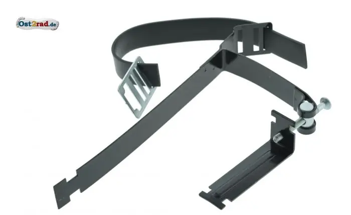 Set Batteriehalter, Spannband und Spannwinkel (Metall) , Schraube, Gummiband EPDM und Kleinteile als Set zur Batteriehalterung. Passend für MZ Typen ETZ125, ETZ150, ETZ250 und ETZ251, auch als Ersatz wenn bisher nur „Speichen“ als Befestigung verwendet waren. Einstellbar und biegsam, vorgesehen um auch den Glülampenersatzkasten zu halten. Deutsche Produktion – KTL Tauchbeschichtet – hervorragender Rostschutz.