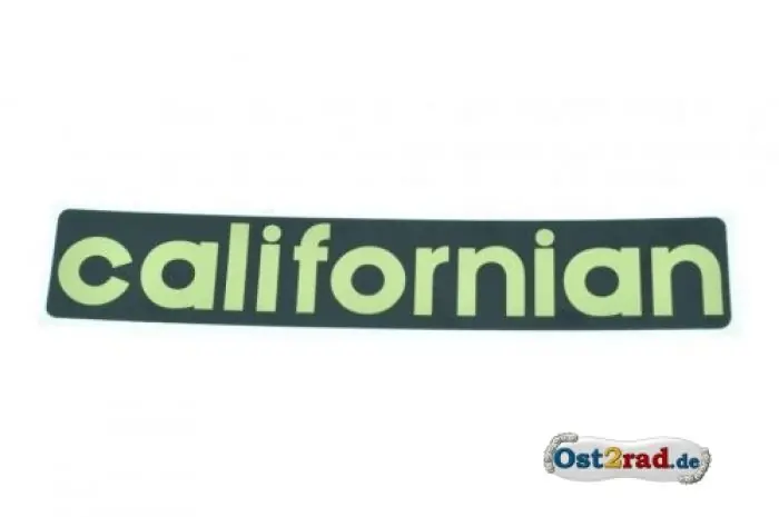 Neuer Schriftzug mit der Aufschrift „californian“ in gold auf schwarzem Hintergrund für den Seitenkasten passend für JAWA 350ccm Typ 362 Californian. Abmaße ca. 120mm x 20mm.