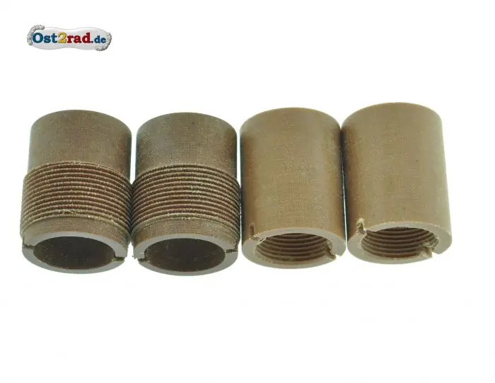 Obere und untere Führungsbuchsen aus Pertinax, passend für DKW RT 125 -0, für die Vordergabel. Mit Innengewinde oder Außengewinde und Einkerbungen. Der Innendurchmesser ist 14,9 mm, deutsche Produktion