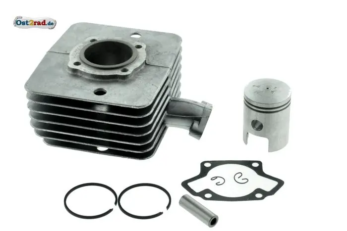 Neuer Zylinder mit 60ccm / 63ccm inklusive Tuningkolben mit Durchmesser 45,00mm (Grundmaß), Kolbenringe, Kolbenbolzen, Spangen und Fußdichtung passend für Simson S50. Es handelt sich um einen Importzylinder, allerdings um kein „Billigprodukt“.