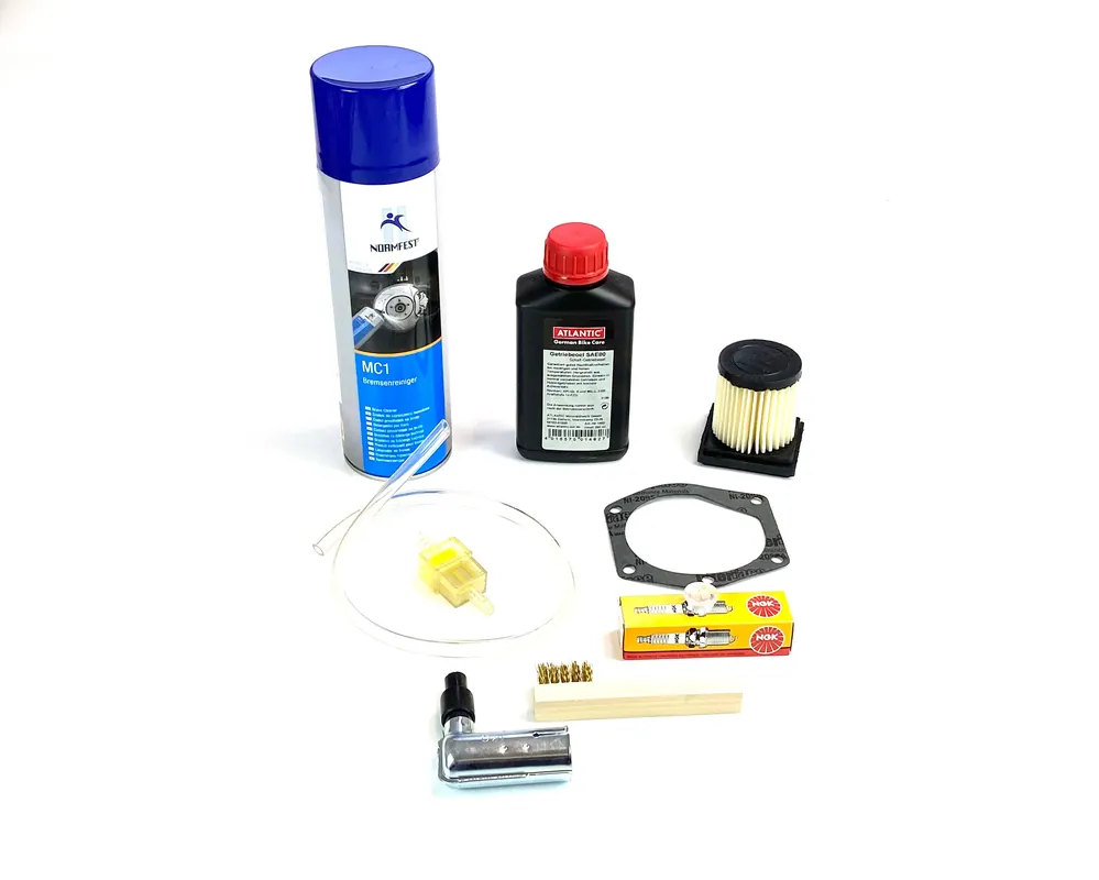 1 x 500ml Bremsenreiniger (Marke je nach Verfügbarkeit) ideal für alle mit Öl beschmutzen Teile am Motor, 1 x 250ml Geriebeöl SAE 80 (Marke je nach Verfügbarkeit), 1 x Ölablass Schraube, 1 Getriebedeckel Dichtung, 1 x Zündkerze NGK B6HS, 1 wasserdichter Zündkerzenstecker, 1 x kleine Drahtbürste, 1 Benzinfilter (Design je nach Verfügbarkeit), 1 x 0,5 Meter Benzinschlauch, 1 x Luftfilter für eckigen Luftfilterkasten