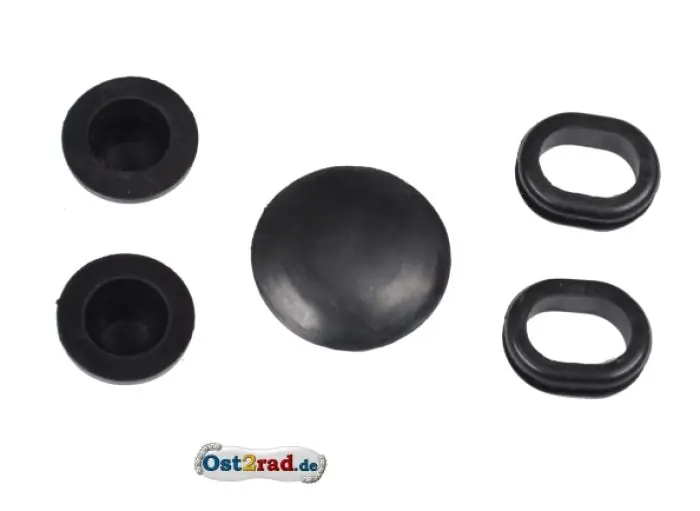 5-teiliges Gummiset, passend für die Lampe am Simson SR2 und SR2E, bestehend aus 2 Stück Kabeldurchführung Scheinwerfer, 2 Stück Kabeldurchführung am Lampenhalter und ein Gummi für Durchführung der Tachowelle. Einige Gummis müssen aufgeschnitten werden um eine gute Dichtheit zu erreichen.