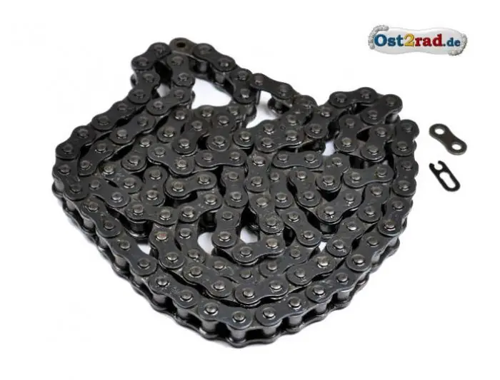 Antriebskette, 130 Glieder passend für MZ der Typen ES250, ES300, ES250/1, ES250/2 und ETS250 Trophy. Hersteller ist die Firma Büchel aus Barchfeld, Thüringen. Diese Kette ist deutsche Produktion! Die Kette muss je nach Zähnezahl der Ritzel und Stellung des Hinterrades etwas gekürtzt werden. Dies ist einfach möglich, durch das mitgelieferte Kettenschloss ist ein Zusammenbau der Kette leicht möglich.