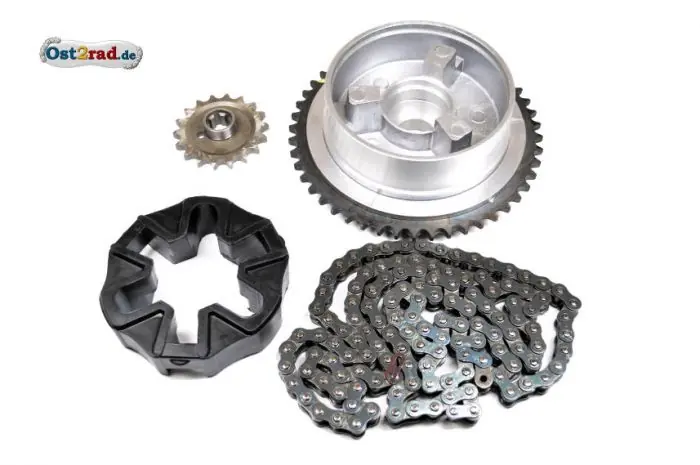 Inhalt: Kettenrad mit Mitnehmer, Rollenkette Büchel, vorderes kleines Ritzel, Dämpfungsgummi. Bewährte Qualität. Mit diesem Set, passend für ETZ 250, sind Ihre Antriebsteile wieder komplett neu!