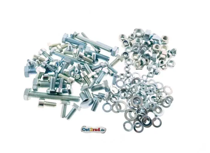 Neues Set Schrauben für den Rahmen der Simson AWO Sport und AWO Touren. Dieser Satz enthält die notwendigen Senkkopf-, Innensechskant- und Sechskantmaschinenschrauben Schrauben, der Festigkeitsklasse 8.8. Außerdem die Flachrundschrauben der Kotflügel, sowie die erforderlichen Muttern, Unterlegscheiben, Federscheiben und Federringe, die im gesamtem Motorrad einschließlich der Auspuffschrauben eingesetzt sind. Nur die Schrauben im Motor und Getriebe sind nicht enthalten. Das Set besteht aus 198 hochglanzverzinkten Teilen.