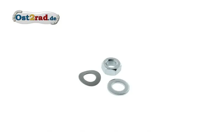 Mutter mit Federscheibe und Unterlegscheibe, passend an vordere Achse von Simson S50, S51, S70, SR50, SR80 und baugleiche Typen, verzinkt DIN-Norm.