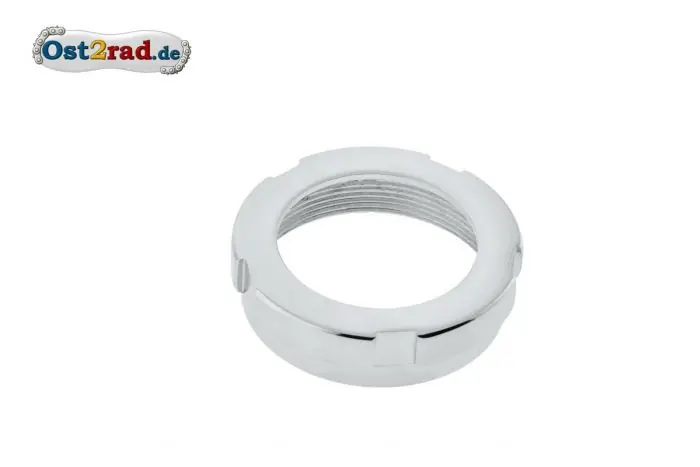 Neue Überwurfmutter für den Krümmer zur Befestigung am Zylinder passend an IFA BK 350. Hochwertige Nachfertigung, originalgetreu und aufwendig verchromt.