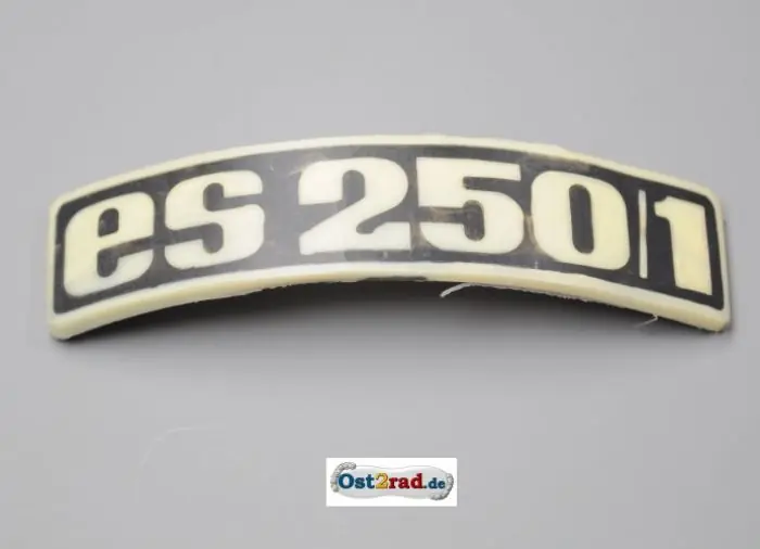 Neues Emblem für den MZ ES 250/1 Hinterradkotflügel mit der Aufschrift ES250/1. Diese Plakette ist aus Plastik und gebogen.