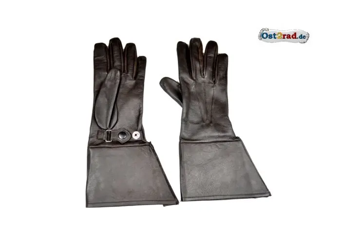 Ein Paar neue Handschuhe speziell für unsere Oldtimer Freunde. Dieser Handschuh ist mit verlängertem Schaft, die gesamte Länge ist ca. 34cm. Am Handgelenk befindet sich ein Verstellband mit Druckknopf zum wasserdichten Abschließen. Das Materiel ist echtes, sehr weiches Nappaleder, Ziegenleder. Die Farbe ist schwarz. Gefertigt in Handarbeit, beste Verarbeitung und Lederqualität!