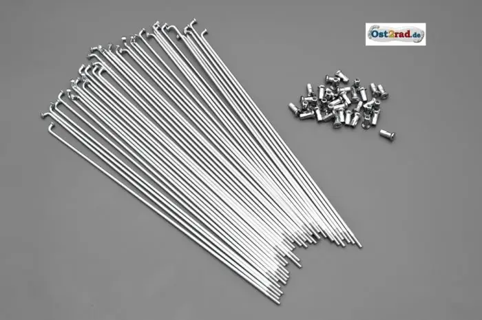 36 Stück Speichen passend für SIMSON Oldtimer SR1. Dieser Satz besteht aus 18 Stück Speichen 260mm, 18 Stück Speichen 250mm und 36 Speichennippel M3. Die Speichen sind für ein Vorderrad mit 22 Zoll Felge geeignet.