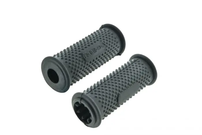 2 Stück neue Fussrastengummis, passend universal an Oldtimer Motorräder. Innen mit Sternaufnahme, damit passend für ca. 19 – 24 mm Durchmesser der Fußrastenrohre. Länge ca. 112 mm, massive Ausführung, Außendurchmesser ca. 38 mm. Der Gummi hat die Aufschrift RIESA. Farbe schwarz mit Pyramiden – Karo – Muster, Originalform. Durch die innere, gerippte Aufnahme universal passend für Rohre von 19-24mm.