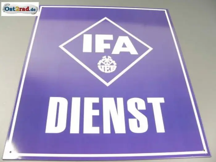 Neues Schild mit Aufdruck Emblem IFA Dienst, nachgefertigt nach dem originalen Emailleschild. Abmaße Schild ca. 39cm x 33cm.