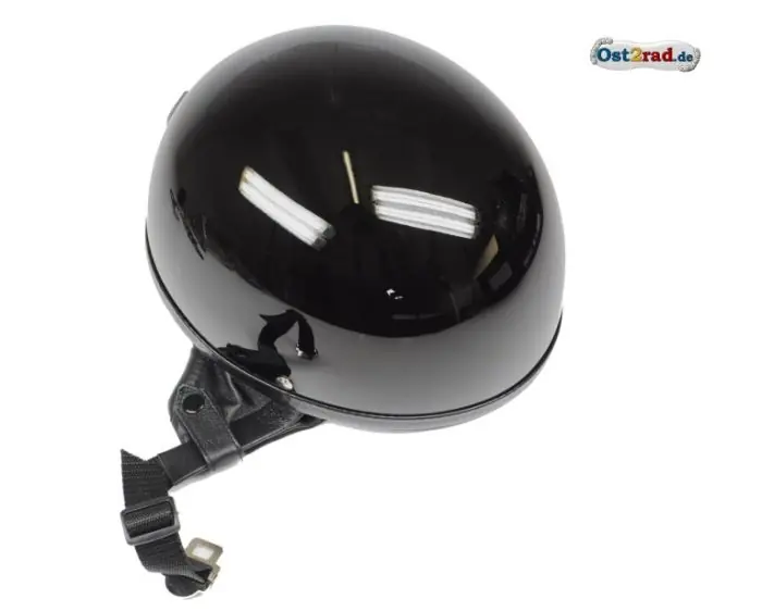 Neuer Moped- und Motorradhelm in der originalen Optik der 50er und 60er Jahre aus Fiberglas, schwarz glänzend. Dieser Helm ist gefüttert. Seitenlaschen und Nackenansatz aus schwarzem Leder. Sehr gute, originale Optik und guter Tragekomfort.